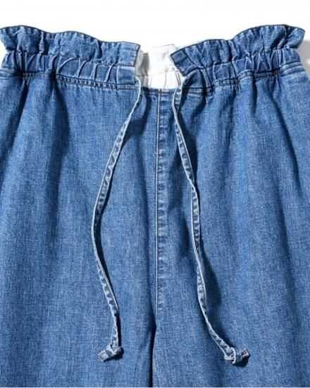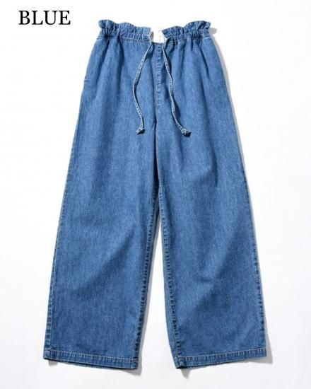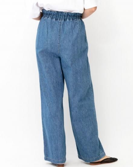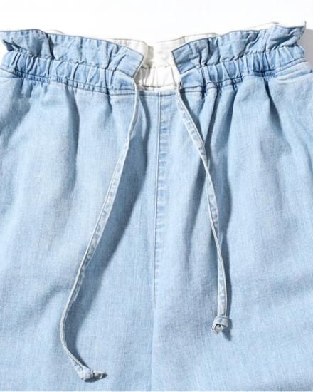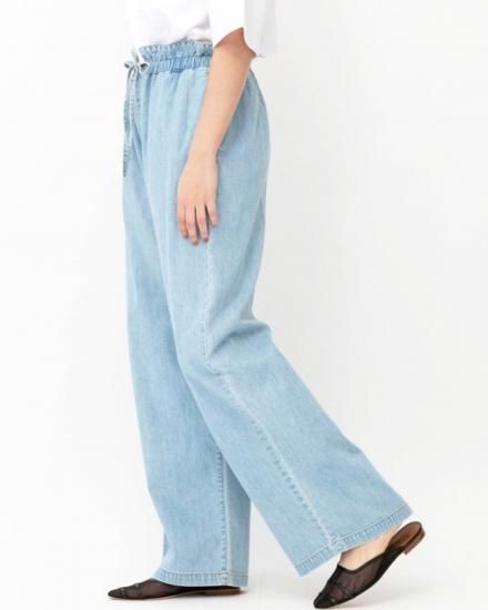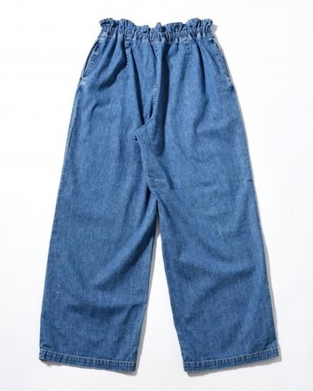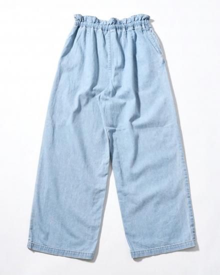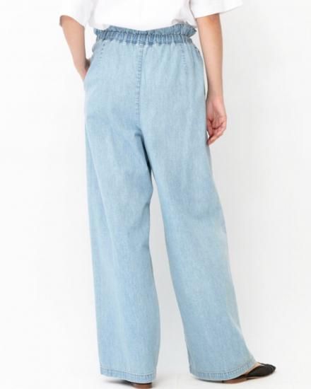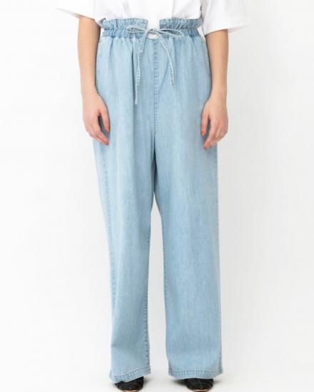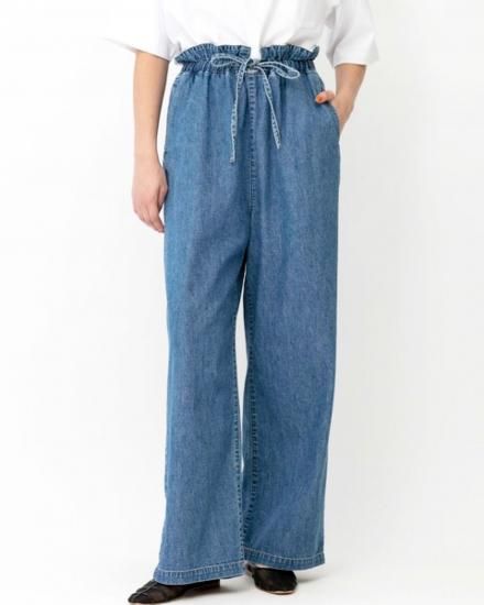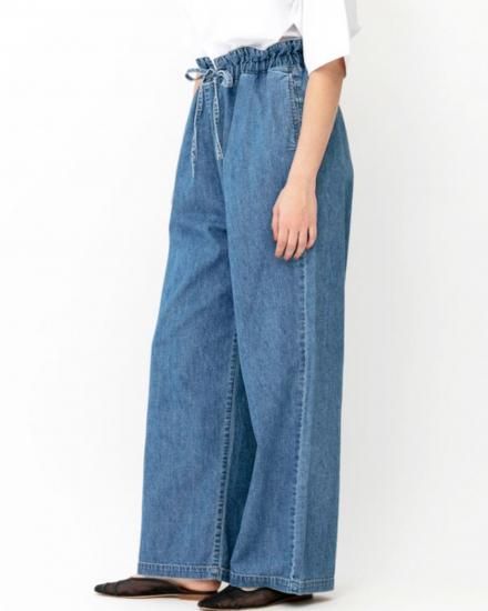 7.5オンスの薄手のデニムを使用したイージーパンツ。軽めの素材感と、ゆったりしたサイズ感、ウエストのフリルが女性らしく、ラフに着用していただけます。・軽めでゆったりしたイージーパンツ・体形カバーが叶うゆったりとしたシルエット・春夏秋と長く着回せる素材感