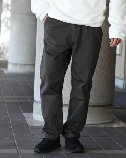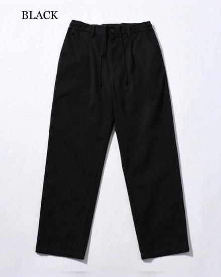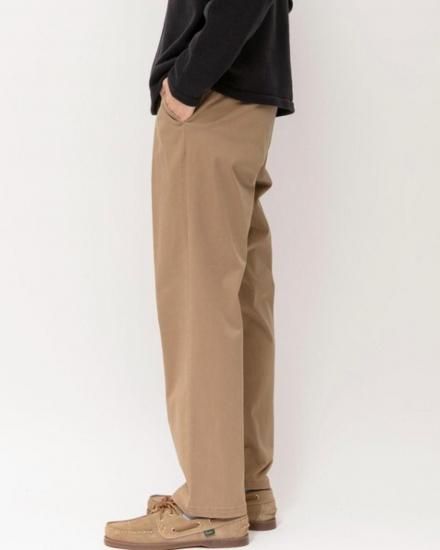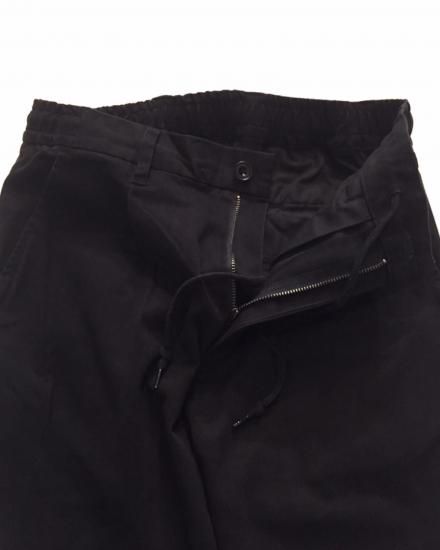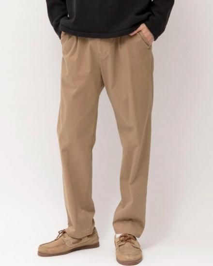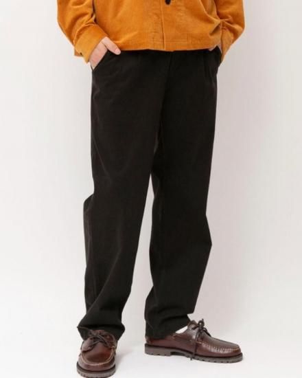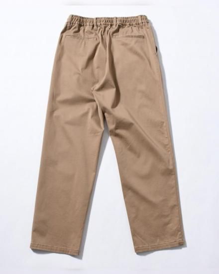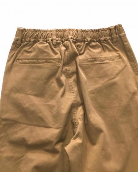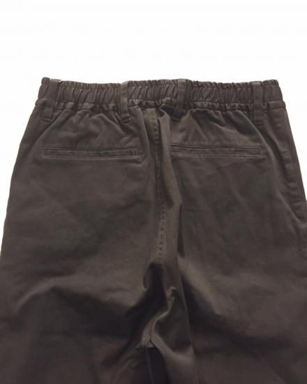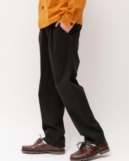 ストレッチ性のある素材を使用したイージーパンツ。起毛しているモールスキン生地に洗い加工をすることで、ユーズドライクなアタリ感が出て古着のような雰囲気に仕上げています。伸縮性のある生地に加えて、ウエストの後ろ部分はゴム仕様のため、穿き心地は抜群!ヒップ部分はゆとりをもたせて、裾に向かって細くなるシルエットです。秋冬春とロングシーズン活躍するベーシックパンツです。
