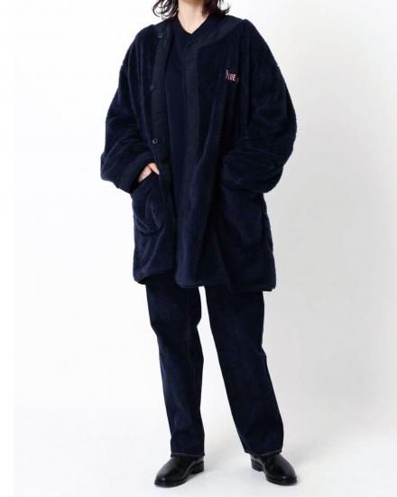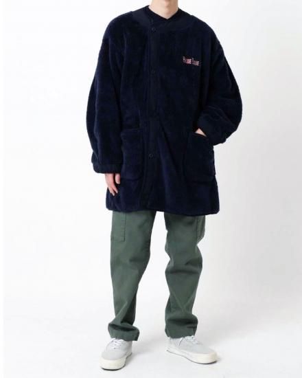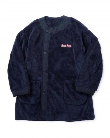 M-65フィッシュテールパーカのライナーをモチーフにしたフリースジャケットです。軽くて柔らかく、保温性の高いボアフリース生地を両面に使用しています。着丈を長めに設定しており、コート感覚でもご使用いただける汎用性の高さが魅力です。左胸の刺繍ロゴがワンポイントになっています。裏返して、古着のM-65フィッシュテールパーカーや、BLUE BLUEオリジナル商品のヴィンテージタッサーフィッシュテールコート、ジャガードデニムフィッシュテールコートにも脱着可能な仕様です。