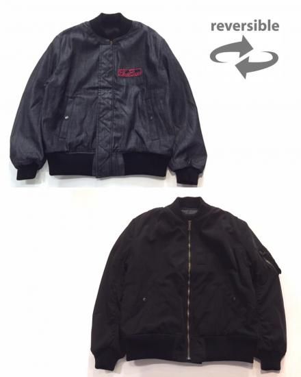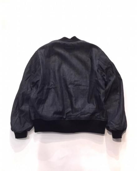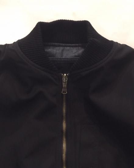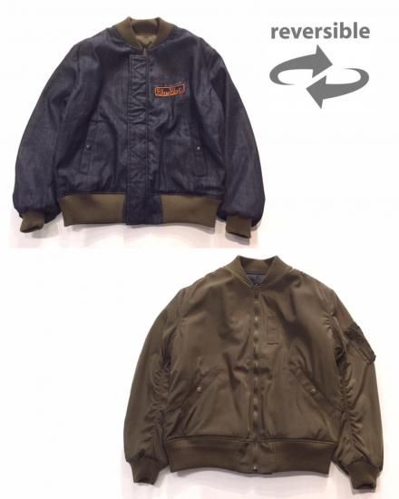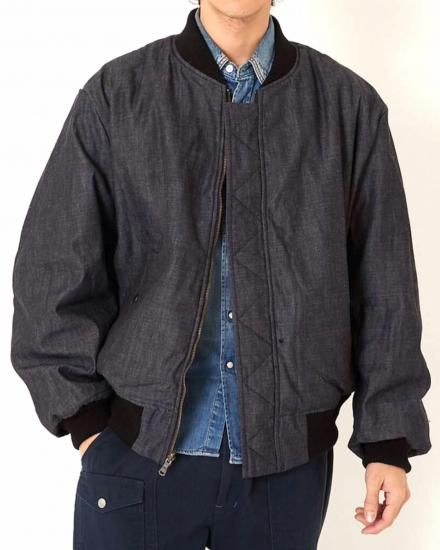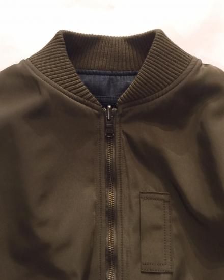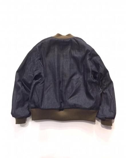 ミリタリーアウターの代名詞であるMA-1ジャケットです。ペットボトルをリサイクルしたサスティナブルファブリックのポリエステルをしようしています。綿のようなマットな風合いでとてもしなやかな生地です。デニムはワークシャツで使用しているジャカード織機で織ったオリジナル生地になります。着丈が短くなり過ぎないように調整したゆったりとしたシルエット。表地は通常のMA-1の生地よりマットで柔らかく、コーディネートのしやすさと着やすさを意識しました。裏地のオリジナルデニムはあえて未洗いで、きれいな表情にしました。サスティナブルファブリックとオリジナルデニムのリバーシブル仕様で、表裏でガラッと違う印象を演出します。